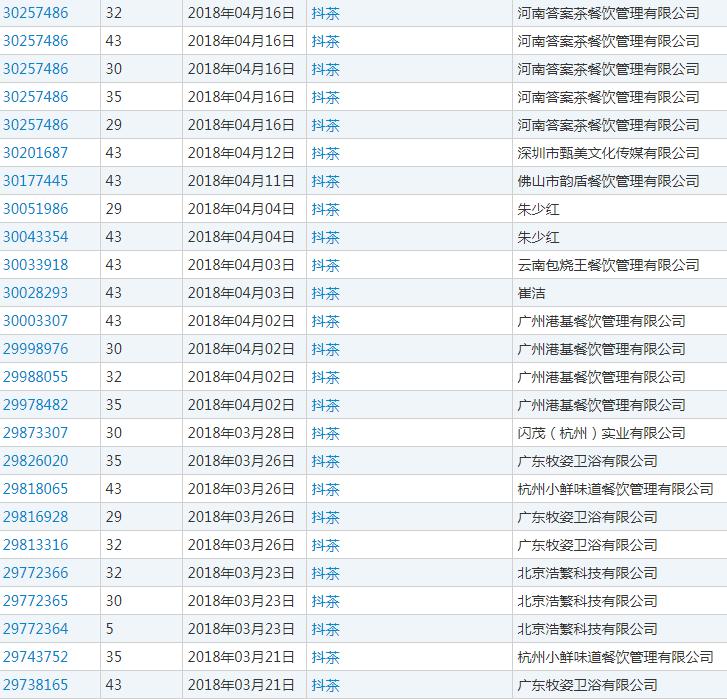 (“抖茶”商標在2018年1月到5月盲查期內約不同的申請人申請60余次)
