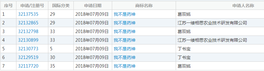 在生活中存在這樣一種“怪”現象:當一部電影或者電視劇大火的時候,當出現新的社會熱點的時候,總會刮起一陣商標搶注的狂潮。電視劇如“花千骨”、“羋月傳”等,流行詞匯如“洪荒之力”、“老鐵”、“藍瘦香菇”等,當它們進入公眾視野的之時往往就有人將其搶注為商標。在“藥神”如此火爆的情況下,搶注人自然不會放過這個熱點,除了蜂擁而上搶注“我不是藥神”的電影名,連電影中出現的抗癌藥“格列寧”也沒能逃過“毒手”。以下是近期被搶注商標列表: